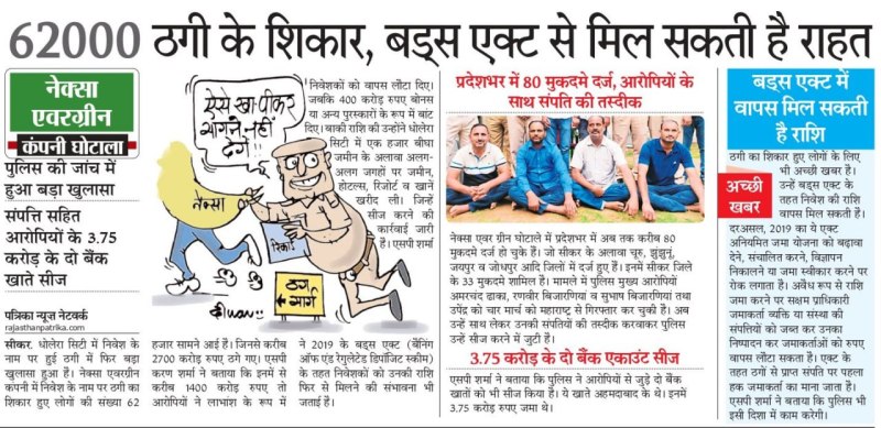 धोलेरा सिटी में निवेश के नाम पर हुई ठगी में फिर बड़ा खुलासा हुआ है। नेक्सा एवरग्रीन कंपनी में निवेश के नाम पर ठगी का शिकार हुए लोगों की संख्या 62 हजार सामने आई है। जिनसे करीब 2700 करोड़ रुपए ठगे गए। एसपी करण शर्मा ने बताया कि इनमें से करीब 1400 करोड़ रुपए तो आरोपियों ने लाभांश के रूप में निवेशकों को वापस लौटा दिए। जबकि 400 करोड़ रुपए बोनस या अन्य पुरस्कारों के रूप में बांट दिए। बाकी राशि की उन्होंने धोलेरा सिटी में एक हजार बीघा जमीन के अलावा अलग- अलग जगहों पर जमीन, होटल्स, रिजोर्ट व खानें खरीद ली। जिन्हें सीज करने की कार्रवाई जारी है। एसपी शर्मा ने 2019 के बड्स एक्ट (बैनिंग ऑफ एंड रेगुलेटेड डिपॉजिट स्कीम) के तहत निवेशकों को उनकी राशि फिर से मिलने की संभावना भी जताई है।