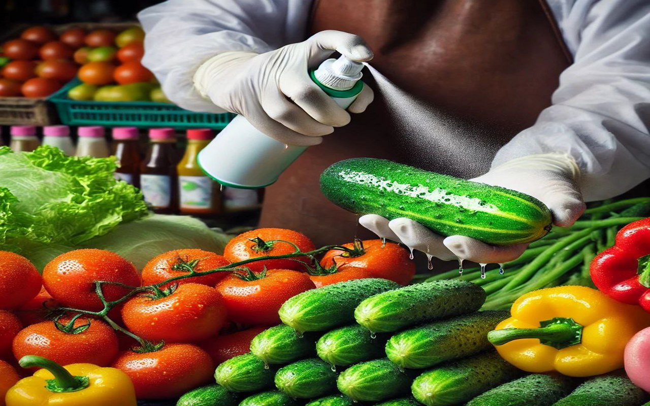 सब्जी को ताजा बनाने के लिए स्पे करते हुए कैरीकेचर