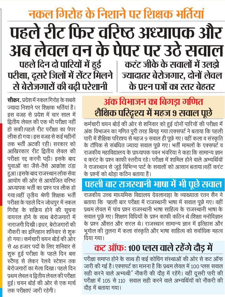 प्रदेश में नकल गिरोह के सबसे ज्यादा निशाने पर शिक्षक भर्तियां है। इस वजह से प्रदेश में चार साल में द्वितीय लेवल की एक भी परीक्षा नहीं हो सकी।पहले रीट परीक्षा का पेपर लीक हो गया। इस वजह से कई महीनाें तक भर्ती अटकी रही।सरकार को