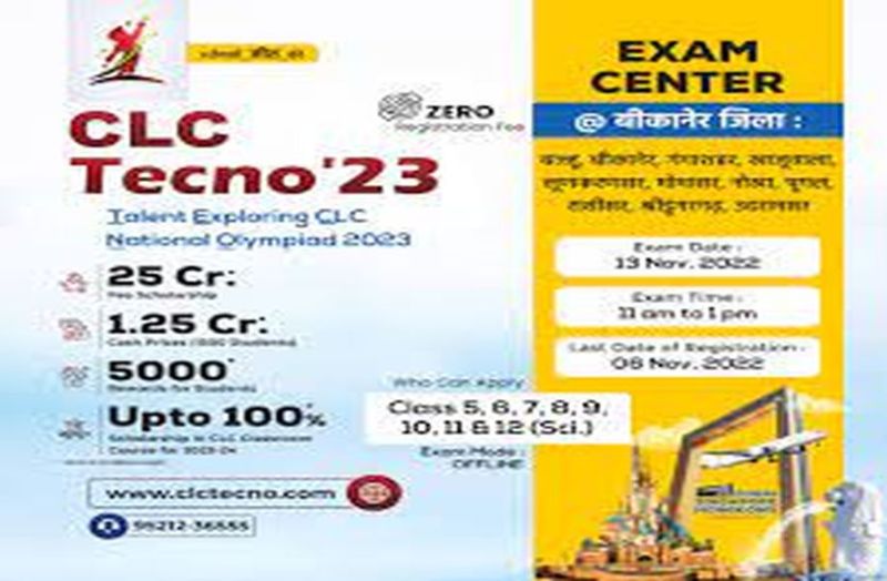 सीएलसी कोचिंग संस्थान की ओर से टेलेंट एक्सप्लोरिंग सीएलसी नेशनल ओलंपियाड टेक्नो-23 का जिलेवार चरणबद्ध आयोजन किया जाएगा। सीएलसी निदेशक इंजीनियर श्रवण चौधरी ने बताया कि किसी भी बोर्ड का कक्षा 5 से 10 तथा कक्षा 11 व 12 में विज्ञान वर्ग का विद्यार्थी टेक्नो 23 में भाग ले सकता है। इसके लिए ऑनलाइन आवेदन करना होगा। परीक्षा में राजस्थान व हरियाणा के 55 जिलों के 310 परीक्षा केंद्रों पर ऑफलाइन आयोजित की जाएगी। चार चरणों में आयोजित परीक्षा में सभी कक्षाओं के लिए वस्तुनिष्ठ सवाल पूछे जाएंगे। परीक्षा का समय सुबह 11 से दोपहर 1 बजे तक का रहेगा। अभ्यर्थी ऑनलाइन आवेदन के बाद अपने जिले की परीक्षा तिथि से दो दिन पहले अपना प्रवेश पत्र डाउनलोड कर सकते हैं।