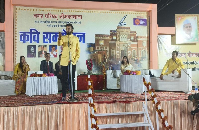 नीमकाथाना. नगर पालिका से नगर परिषद में क्रमोन्नत होने एवं गांधी जयंती पर मंगलवार को परिषद की ओर से रामलीला मैदान में कवि सम्मेलन का आयोजन किया गया। कार्यक्रम में विधायक सुरेश मोदी, जिला कलक्टर श्रुति भारद्वाज, पुलिस अधीक्षक अनिल कुमार, सभापति सरिता दीवान, उपसभापति महेश मेगोतिया, उपखंड अधिकारी राजवीर यादव, तहसीलदार महेश कुमार ने शिरकत की। इस दौरान सुप्रसिद्ध हास्य कवि कविता तिवारी, संपत सरल, हरीश हिन्दुस्तानी, दीपा सैनी, हिमांशु के व्यंग्य और हास्य रचनाओं को सुनकर लोग हास्य मुग्ध होकर ठहाके लगाते रहे। मंच से कवयित्री कविता तिवारी गीतों से लोगों ने श्रंगार रस का आनंद लिया। वहीं वीर रस के कवियों ने अपनी पंक्तियों को स्वर देकर श्रोताओं में जोश भरे।