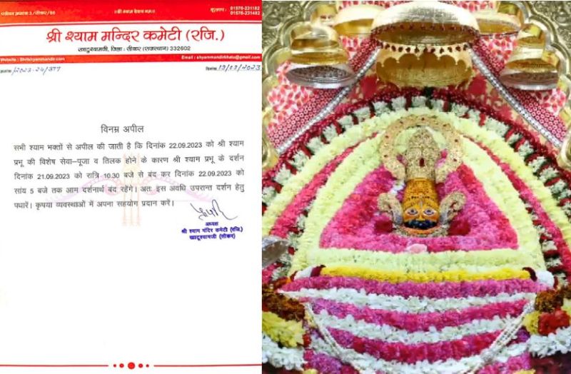 श्री श्याम मन्दिर कमेटी ने विनम्र अपील करते हुए आदेश जारी किया कि सभी श्याम भक्तों से अपील की जाती है कि दिनांक 22.09.2023 को श्री श्याम प्रभू की विशेष सेवा-पूजा व तिलक होने के कारण श्री श्याम प्रभू के दर्शन दिनांक 21.09.2023 को रात्रि 10.30 बजे से बंद कर दिनांक 22.09.2023 को सांय 5 बजे तक आम दर्शनार्थ बंद रहेंगे। अतः इस अवधि उपरान्त दर्शन हेतु पधारें। कृपया व्यवस्थाओं में अपना सहयोग प्रदान करें।
