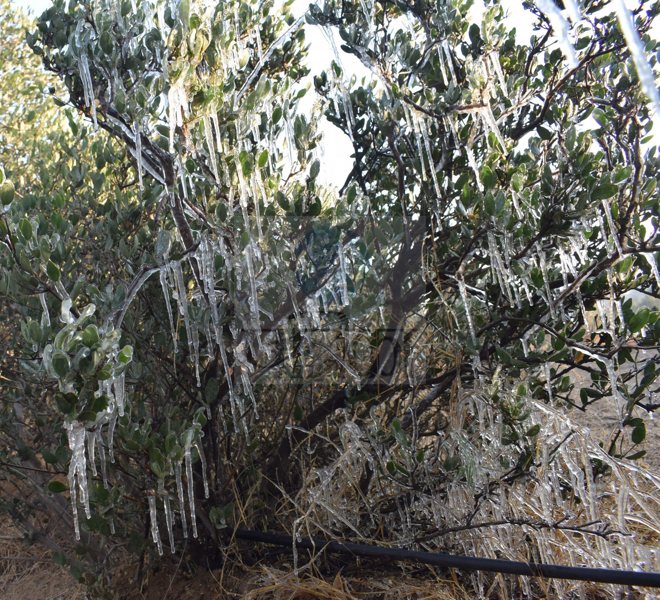पेड़ों व फसलों पर जमी बर्फ
