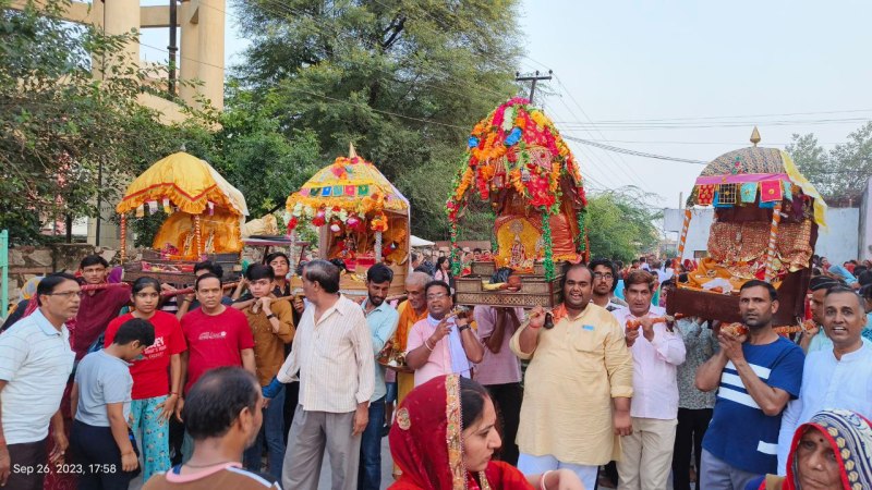 नीमकाथाना. कृष्ण जन्मोत्सव के बाद मंगलवार को जल झुलनी एकादशी पर्व पर भक्तों ने ठाकुर जी महाराज को मंदिर दरबार की चौखट से बाहर निकाल कर नगर भ्रमण करवाया। इस दौरान श्रद्धालुओं ने शंख,घडिय़ाल भजन किर्तन गाते हुए शौभायात्रा में शामिल हुए। शहर के सभी मंदिरों में विराजमान ठाकुर जी महाराज गणगौर चौक में स्थित हुए। इसके बाद वहा से सभी लाइन से नृसिंह मंदिर पहुंचे। इस दौरान महिलाओं ने महाराज की पूजा अर्चना कर सूख समृद्वि की कामना की। शोभायात्रा के दौरान श्रद्धालुओं को ठाकुर जी की पालकी के नीचे से निकलने की होड लगी रही। नृङ्क्षसह मंदिर के बाहर सभी पालकियों को विराजमान कर एक साथ महाआरती की। इसके बाद ठाकुरजी अपने दरबार की ओर लौट गए।