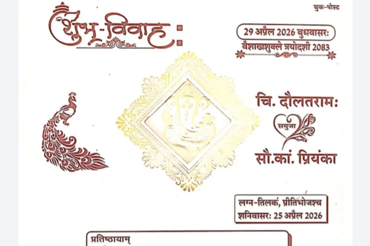 दौलतराम शर्मा का विवाह 29 अप्रेल को आयोजित होगा। विवाह समारोह के लिए छपवाए गए निमंत्रण पत्र में सभी कार्यक्रमों का उल्लेख पूरी तरह संस्कृत भाषा में किया गया है, जिससे कार्ड आकर्षण का केंद्र बना हुआ है।