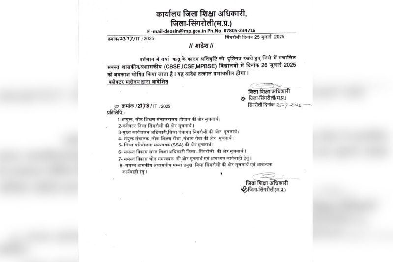 जिले में भारी बारिश के चलते जिला शिक्षा अधिकारी सभी सरकारी और प्राइवेट स्कूलों में शनिवार यानी 26 जुलाई की छुट्टी घोषित कर दी गई है। यह आदेश तत्काल प्रभाव से लागू होगा।