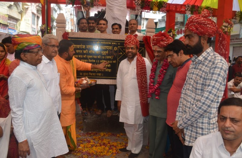 167 साल पूर्व तत्कालानी सिरोही रियासत के महाराव शिवसिंह ने नगर सेठ कालूराम लोढ़ा को नगर सेठ की पदवी से विभूषित कर जिस स्थान पर नगर की नींव रखी थी, वहीं मंगलवार को अतिथियों ने नगर की स्थापना के शिलालेख का अनावरण एवं झंडारोहण कर शिवगंज महोत्सव का शुभारंभ किया। महाराव रघुवीरसिंह ने शिलालेख व नगर की कुंडली पर कुमकुम का स्वस्तिक बनाकर दो शताब्दी पूर्व की परम्परा को एक बार फिर से जीवंत कर दिया। पांडाल में मौजूद महिलाओं ने कोमल परिहार की अगुवाई में Òजय जय शिवगंज, हमारा शिवगंजÓ के जयघोष से वातावरण को गूंजा दिया।