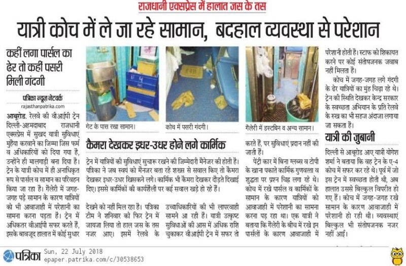 दिल्ली से आबूरोड आए यात्री योगेश शर्मा ने बताया कि वह ट्रेन के ए-४ कोच में सफर कर रहे थे। पूर्व में जो इस ट्रेन में स्वच्छता होती थी, अब हालात उससे बिल्कुल विपरीत हो गए हैं। कोच में जगह-जगह रखे सामान के कारण आवाजाही में परेशानी हो रही थी। व्यवस्थाएं बिल्कुल भी संतोषजनक नजर नहीं आईं।कैमरा देखकर इधर-उधर होने लगे कार्मिक