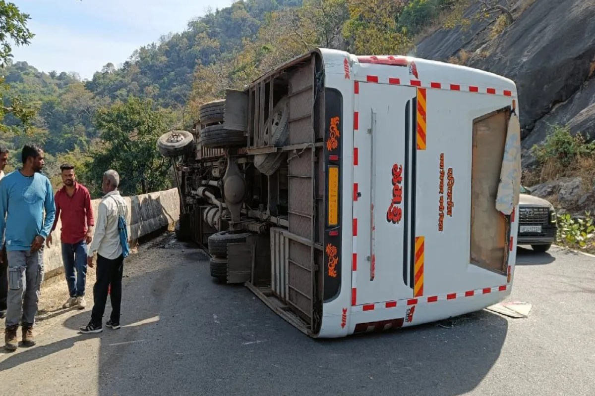 आबूरोड/माउंट आबू। पर्यटन स्थल माउंट आबू में आबूरोड-माउंट आबू मार्ग पर वीर बावसी मंदिर के पास 60 पर्यटकों से भरी एक निजी बस अनियंत्रित होकर पलट गई। गनीमत रही कि बस सुरक्षा दीवार से टकराकर सड़क पर ही पलटी, अन्यथा गहरी खाई में गिरने से बड़ा हादसा हो सकता था। बस पलटते ही यात्रियों में चीख-पुकार मच गई।
