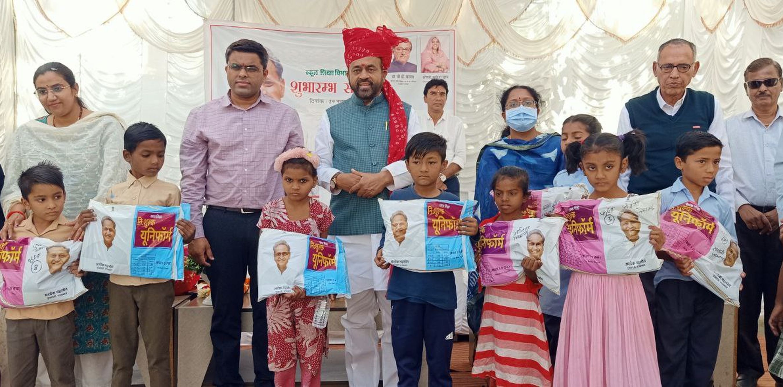 सिरोही. मुख्यमंत्री बाल गोपाल योजना एवं मुख्यमंत्री निशुल्क स्कूल युनिफॉर्म योजना के शुभारम्भ पर मौजूद अतिथि व अन्य।