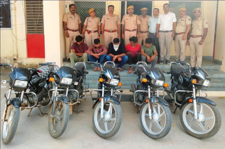 पुलिस ने मोटर साइकिल चोरी के आरोप में भाटकडा सिरोही निवासी अलताफ खान (21), घांचीवाडा सिरोही निवासी मोहम्मद साहिल (20), झुपाघाट सिरोही निवासी गौरव मीणा(22), गोयली निवासी लक्ष्मण रेबारी(23) व आबूरोड हाल पुलिस लाईन सिरोही निवासी कांस्टेबल तरूणराज मीणा(30) को गिरफ्तार कर किया है।