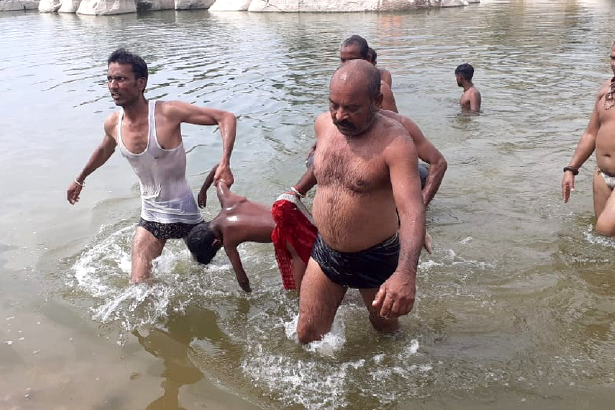 फोटो - शिवगंज. जवाई नदी से बालिका के शव को बाहर निकालकर लाते गोताखोर।