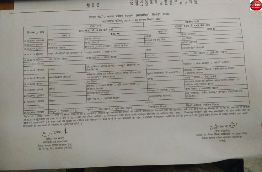 सिरोही. शिक्षा विभाग की ओर से कक्षा 9वीं, 10वीं, 11वीं व 12वीं की अद्र्धवार्षिक परीक्षाएं आगामी 10 दिसम्बर से शुरू होगी। जो 23 दिसम्बर तक चलेगी। परीक्षा दो पारियों में होगी। प्रथम पारी सुबह 9.30 से 12.45 तक इसमें कक्षा 10वीं व 12वीं की परीक्षाएं होगी। वही दूसरी पारी दोपहर 1.30 से 4.45 बजे तक चलेगी इसमें कक्षा 9वीं व 11वीं की परीक्षाएं होंगी।