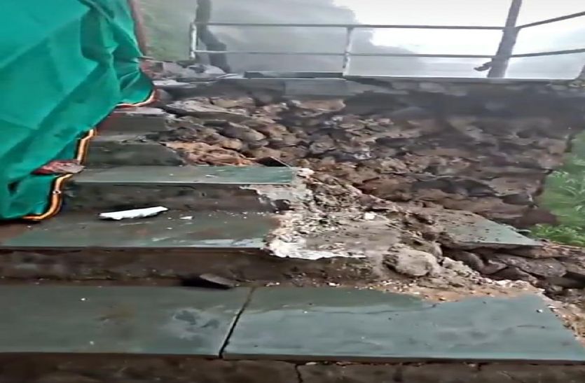 Heavy rian in Mount Abuमाउंट आबू. क्षेत्र में लगातार हो रही मानसूनी बारिश की वजह से अरावली शृंखलाओं की उच्चतम चोटी गुरुशिखर स्थित दत्तात्रेय मंदिर से शिखर की ओर जाने वाले पैदल मार्ग की सीढिय़ां बुधवार को अचानक से धराशायी हो गई। जिससे श्रद्धालुओं व पर्यटकों को भारी परेशानियों का सामना करना पड़ा। हादसे के बाद पर्यटकों को ऊपर जाने से रोक दिया गया। सीढियां टूटकर मार्ग अवरूद्ध होने की जानकारी मिलते ही ओरिया ग्राम पंचायत उपसरपंच तरूण सिंह, वार्डपंच गंगा सिंह, भूराराम माली, लक्ष्मण माली, वनपाल शेर सिंह, उम्मेद सिंह, विक्रम माली, डूंगर सिंह सहित ग्राम पंचायत के कार्मिकों व श्रमिकों का जाब्ता ट्रैक्टर-ट्रॉली में निर्माण सामग्री लेकर ओरिया पंचायत कार्यालय से गुरुशिखर पहुंचा।