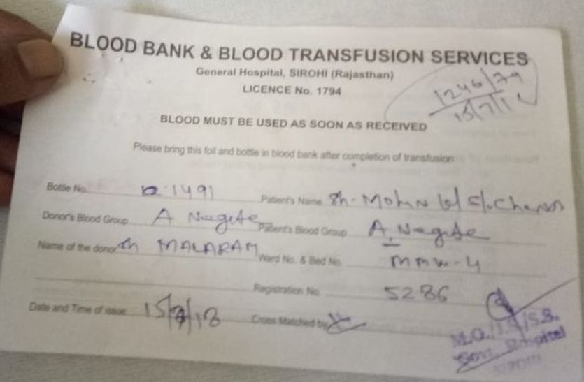 जानकारी के अनुसार चडुआल निवासी मोहनलाल पुत्र चीनाराम मेघवाल को खून की कमी होने के कारण मेडिकल वार्ड में भर्ती करवाया। यहां डॉ. वीरेन्द्र महात्मा ने खून चढ़ाने को कहा। परिजनों ने रिपोर्ट निकलवाई तो एबी पॉजिटिव ब्लड ग्रुप आया। इस पर रिश्तेदार प्रशांत माली को बुलाकर एबी पॉजिटिव रक्तदान करवाया लेकिन आरोप है कि ब्लड बैंक से मरीज को ए नेगेटिव ब्लड दिया तथा उसे चढ़ा भी दिया। इससे मोहनलाल की तबीयत बिगडऩे लगी।पैरों तथा हाथ में सूजन आई तो चिकित्सकों ने रक्त की जांच करवाई। उसमें भी एबी पॉजिटिव आया। मरीज को चढ़ रहे रक्त की थैली पर ए नेगेटिव ब्लड की पर्ची भी लगी हुई थी। मरीज की पुत्री ने इस मामले को लेकर प्रमुख चिकित्सा अधिकारी डॉ. दर्शन ग्रोवर को ज्ञापन देकर ब्लड बैंक वालों के खिलाफ सख्त कार्रवाई की मांग की। ब्लड बैंक में कार्मिकों ने मरीज के परिजनों को दूसरा रक्त दे दिया। इसकी जानकारी लेने पर कार्मिक एक दूसरे पर जिम्मेदारी डालते नजर आए। उधर, चिकित्सा क्षेत्र के जानकार बताते हैं कि एबी पॉजिटिव यूनिवर्सल रिसीवर है। उसे किसी भी ग्रुप का रक्त चढ़ाया जा सकता है। हालांकि प्राथमिकता समान ग्रुप को ही दी जाती है।