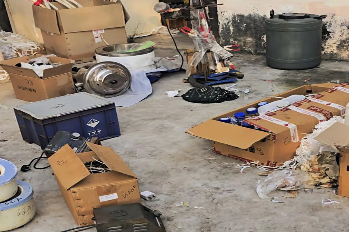 मुखबिर से मिली पुख्ता सूचना पर रेवदर पुलिस टीम ने 4 नवंबर को दांतराई क्षेत्र में जोधाराम पुत्र कंवलाजी पुरोहित, निवासी आमपुरा रानीवाड़ा कल्ला (जालोर) के खेत पर बने मकान में दबिश दी। मकान के ताले तोड़कर तलाशी लेने पर वहां 35 जरीकन और 8 बड़े ड्रम केमिकल से भरे मिले। इसके अलावा केमिकल भरी प्लास्टिक की केतलियां, बोतलें, पाउडर से भरे कट्टे, हिटिंग मशीन, थर्मामीटर, राउंड बॉटम फ्लास्क, सेपरेटिक फनल, नोजल ट्यूब आदि लैब उपकरण बरामद किए गए।