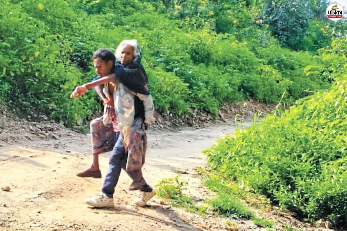 दादी को पीठ पर लादकर इलाज के लिए ले जाता पोता (फोटो-पत्रिका)