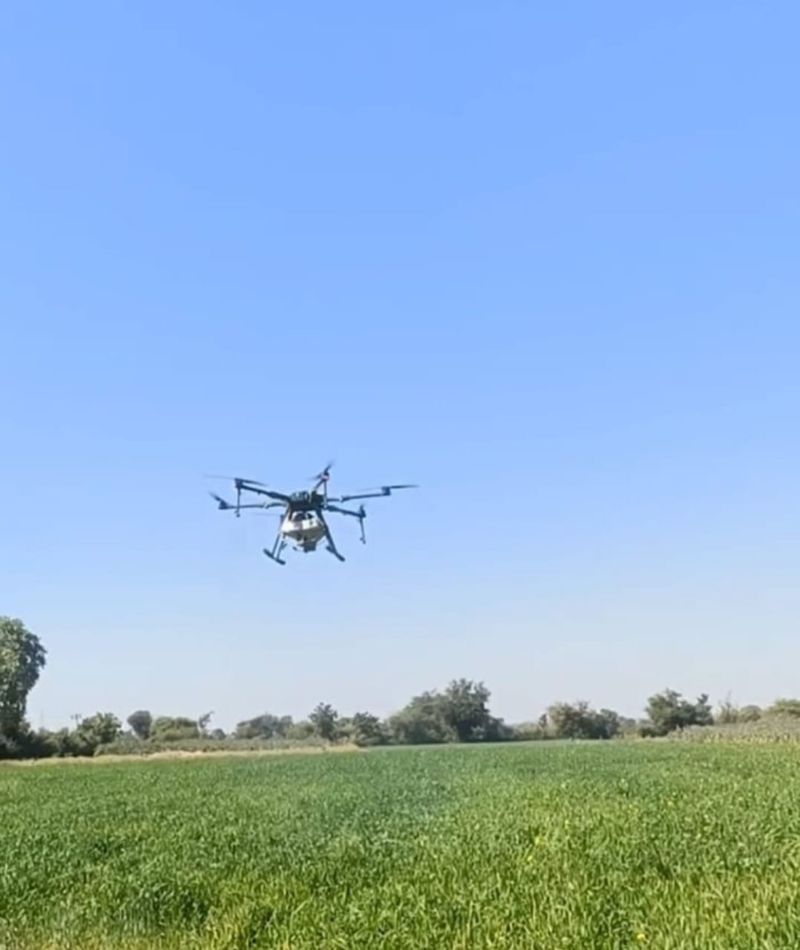 किसान के खेत में ड्रोन तकनीक से नैनो यूरिया का छिड़काव किया तो देखने के लिए उमड़े लोग