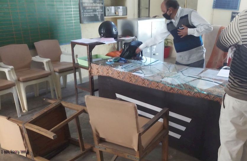 आबूरोड के ओर स्कूल में प्रधानाचार्य कक्ष में टेबल पर फेंकी गई कुर्सी से टूटा कांच व उपस्थित प्रधानाचार्य।