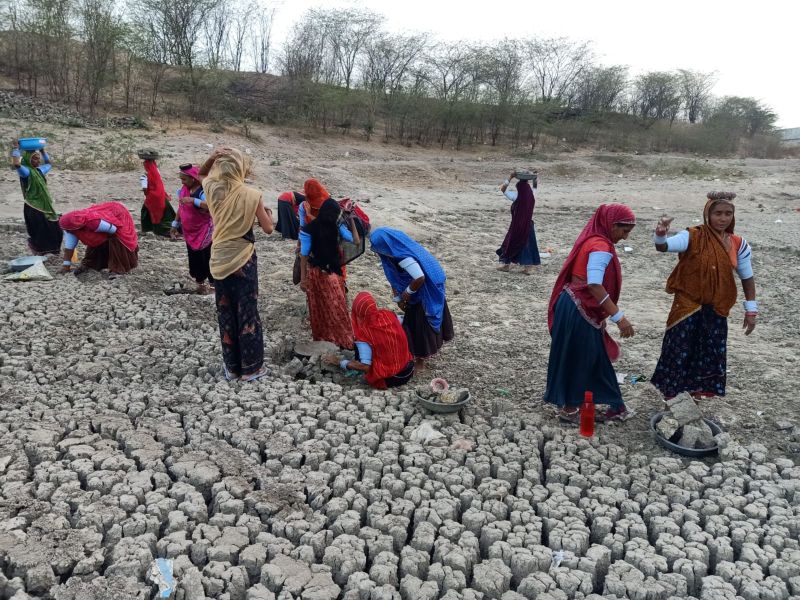 सिरोही. शहर के दुधिया तालाब की मिट्टी को किनारे डालती हुई महिलाएं।