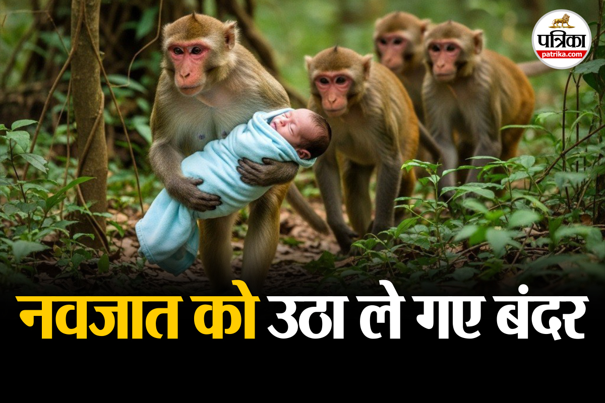 सो रहे नवजात को चारपाई से उठाकर ले गए बंदर। फोटो सोर्स-Ai