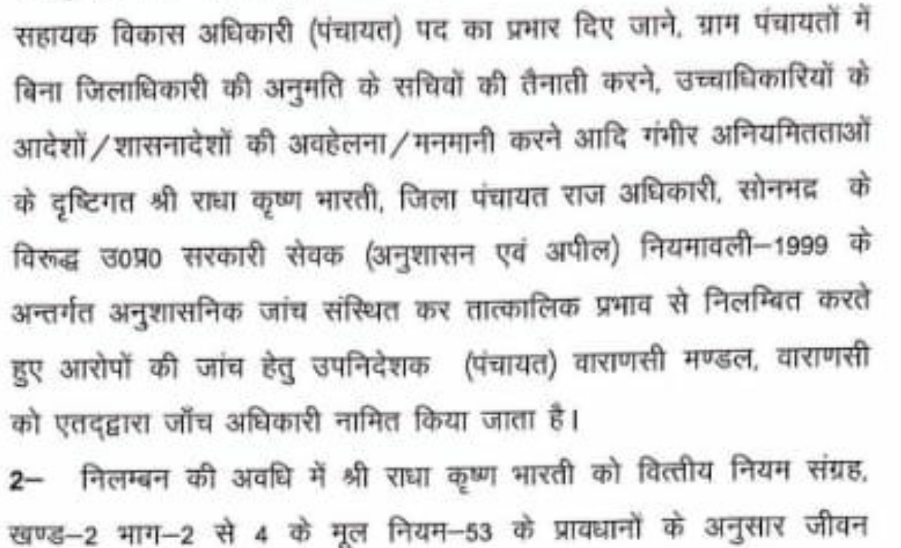 यही नहीं उनके खिलाफ़ ग्राम पंचायतों में बृहद स्तर पर अनिधिकृत सोलर लाइट लगवाने के लिये 64 लाख रुपये व्यय करने और कोटा ग्राम पंचायत में अनियमितता प्रकाश में आने के बाद भी कार्यवाही न करने का लगा आरोप भी लगाया गया है। निलंबन अवधि तक डीपीआरओ आरके भारती को पंचायती राज निदेशालय लखनऊ से संबद्ध कर दिया गया है।