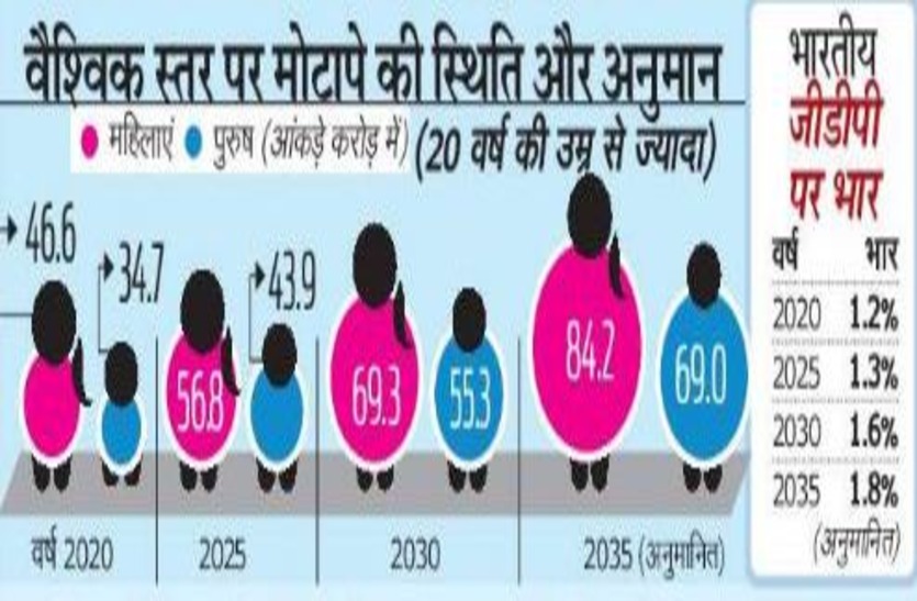 भारतीय महिलाओं में बढ़ेगी मोटापे की समस्या: भारत में 2020-2035 के दौरान वयस्कों में 5.2 फीसदी और बच्चों में 9.1 प्रतिशत की दर से मोटापे के मामलों में वार्षिक वृद्धि का अनुमान है। आने वाले 12 वर्षों में महिलाएं और लड़के सबसे ज्यादा अत्यधिक वजन की समस्या से जूझ रहे होंगे। देश की जीडीपी पर इसका भार 1.8 प्रतिशत होगा। अत्यधिक वजन का आर्थिक प्रभाव सबसे ज्यादा असामयिक मौतों के रूप में सामने आएगा। बढ़ते वजन की समस्या से निपटने के संबंध में 183 देशों की तैयारी से जुड़ी रैंकिंग में भारत का स्थान 99वां है, जिसे औसत माना गया। पड़ोसी देशों में बांगलादेश 108वें, नेपाल १३९वें और पाकिस्तान 172वें स्थान के साथ कमजोर तैयारी वाली अर्थव्यवस्था रहीं।