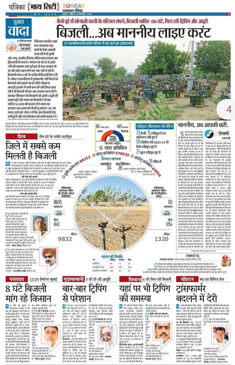 चुनावों से पहले यही माननीय विपक्ष में थे तो अपने इलाके की बिजली को लेकर सड़कों पर बैठे थे और सरकार के खिलाफ आंदोलन किए थे। इनकी जुबान पर था कि किसान के साथ धोखा हो रहा है। उसकी फसलें नष्ट हो रही है। अब, खुद माननीय सरकार हो गए है। किसान, खेत और बिजली की समस्या तीनों वहीं की वहीं है। जरूरी है उन सभी आरोपों को जो उन्होंने जड़े थे अब खुद खड़े रहकर हल करवाए। शिव के किसानों ने पांच साल में लगातार आंदोलन किया। यहां पानी आने के बाद बिजली 03 से 4 घंटा मुश्किल से मिली है। ट्रांसफार्मर जलने के बाद नहीं बदलने का मामला भी काफी गर्माया। रबी के इस मौसम में वही हाल है। किसानों को यहा अब लगातार फरवरी माह तक बिजली नहीं मिली तो फसलें चौपट होगी।किसानों ने मजबूरी में आधा खेत ही बोया है लेकिन यह आधा भी अधूरी बिजली का शिकार नहीं हो जाए। कमोबेश यह स्थितियां अन्य इलाकों में है जहां बिजली के संकट से जूझ रहा किसान खेत, जमीन और पानी तीनों होते हुए भी बिना बिजली के इंतजार कर रहा है। जिले में दस हजार के करीब कृषि कनेक्शन की फाइलें पेंडिंग पड़ी है। लंबित फाइलों का निस्तारण हों तो दस हजार किसान तो कल से ही अपने खेत में हरियळ सपने पूरे करने को तैयार है। किसानों को बिजली के कनेक्शन देने की देरी तो नई सरकार को दूर करनी ही होगी। इधर, ट्रांसफार्मर जलने और उनको बदलने का एक क्रम है। इसमें भ्रष्टाचार इतना बढ़ गया है कि जिसकी जेब में ताकत या रुपया है वे क्रम तोड़कर अपने खेत ट्रंासफार्मर ले जाते है और जो हकदार है वो इंतजार का शिकार हो रहा है। डिस्कॉम की मिलीभगती से यह खेल लंबे समय से चल रहा है। विद्युत चोरी का भी यही आलम है। चोरी की बिजली से चल रहे खेतों की जानकारी तो महकमे के कार्मिक-अफसर रखते है लेकिन वे उन पर मेहरबानी रखते है। यह मेहरबानी भी असली जरूरतमंद की बिजली को खा रही है। इधर ज्यादा कृषि के लिए बिजली की जरूरत से मौजूूदा जीएसएस पर लोड लगातार बढ़ रहा है। 21 जीएसएस की स्वीकृति में से 18 का काम बकाया है। ये जीएसएस स्थापित हों तो संकट कुछ दूर हों। सरकार की प्राथमिकता में बिजली है लेकिन केवल कागजो में।। सच मानिए जिले में 69213 कृषि कनेक्शन है और यहां 50 अरब की फसलें ली जा रही है। जीरा, ईसबगोल और अनार का हब बाड़मेर बन रहा है। यह कनेक्शन एक लाख के पार हों तो सिंचित जमीन लगभग दुगुनी हो जाएगी और रेगिस्तान के जिन इलाकों में फिलहाल पानी है,वहां पर तो फसलें लहलहाती नजर आएगी। किसान के पास मेहनत, जमीन, पानी है लेकिन बिजली नहीं। धरतीपुत्र धान उपजा रहा है जो देश की पहली जरूरत है। अनाज,फसलें और फल की उपज देश की आर्थिक उन्नति का बड़ा आधार है। देश की आर्थिक संपन्नता के लिए ही सही पर सरकार यह सोचे कि धरतीपुत्र के घर मु_ीभर आएगा लेकिन देश के हिस्से दोनों हथेल