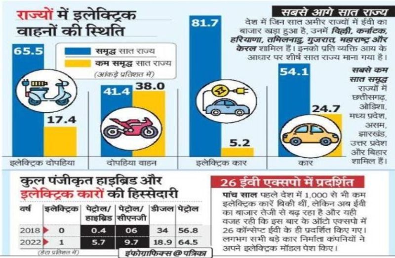 तकनीकी प्रगति और जीवाश्म ईंधन को लेकर चिंता ने भारत में इलेक्ट्रिक वाहनों (ईवी) की तादाद बढ़ाई है। देशभर में इलेक्ट्रिक वाहनों की दौड़ में गुजरात, कर्नाटक, महाराष्ट्र सहित सात समृद्ध राज्य आगे हैं, जिनकी इलेक्ट्रिक कारों में 82 फीसदी और इलेक्ट्रिक स्कूटर की बिक्री में 65 प्रतिशत की हिस्सेदारी है। इस तरह भारत का ईवी मार्केट समृद्ध राज्यों में तेजी से बढ़ रहा है। सरकारी आंकड़ों के अनुसार पिछले पांच वर्षों में इलेक्ट्रिक कारों की बिक्री में वृद्धि साल दर साल 141 प्रतिशत रही है। जबकि पेट्रोल और बैटरी पर आधारित हाइब्रिड कारों की बिक्री इसी अवधि में सालाना 101 फीसदी बढ़ी।