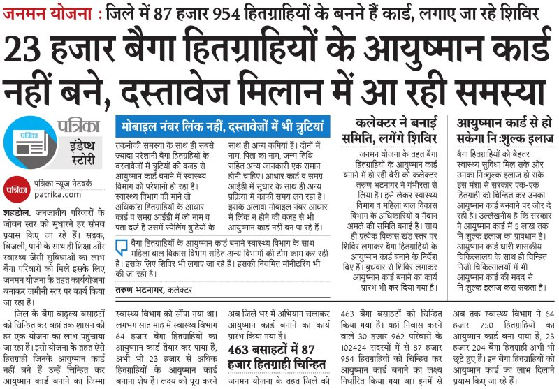 जनमन योजना के तहत जिले की 463 बैगा बसाहटों को चिन्हित किया गया है। यहां निवास करने वाले 30 हजार 962 परिवारों के 102424 सदस्यों में से 87 हजार 954 हितग्राहियों को चिन्हित कर आयुष्मान कार्ड बनाने का लक्ष्य निर्धारित किया गया था। इनमें से अब तक स्वास्थ्य विभाग ने 64 हजार 750 हितग्राहियों का आयुष्मान कार्ड बना पाया है, 23 हजार 204 बैगा हितग्राही अभी भी छूटे हुए हैं। इन बैगा हितग्राहियों को आयुष्मान कार्ड का लाभ दिलाने प्रयास किए जा रहे हैं।