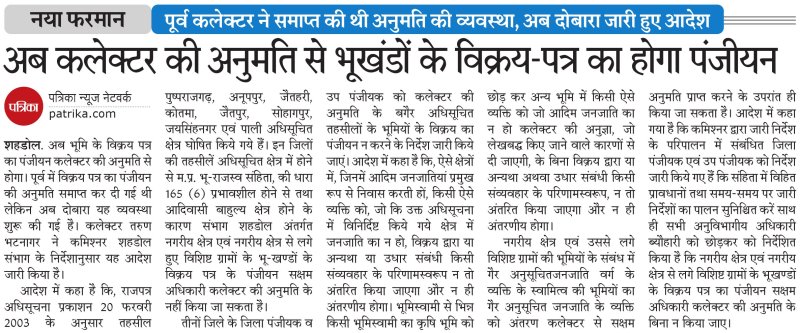 शहडोल. अब भूमि के विक्रय पत्र का पंजीयन कलेक्टर की अनुमति से होगा। पूर्व में विक्रय पत्र का पंजीयन की अनुमति समाप्त कर दी गई थी लेकिन अब दोबारा यह व्यवस्था शुरू की गई है। कलेक्टर तरुण भटनागर ने कमिश्नर शहडोल संभाग के निर्देशानुसार यह आदेश जारी किया है। आदेश में कहा है कि, राजपत्र अधिसूचना प्रकाशन 20 फरवरी 2003 के अनुसार तहसील पुष्पराजगढ़, अनूपपुर, जैतहरी, कोतमा, जैतपुर, सोहागपुर, जयसिंहनगर एवं पाली अधिसूचित क्षेत्र घोषित किये गये हैं। इन जिलों की तहसीलें अधिसूचित क्षेत्र में होने से म.प्र. भू-राजस्व संहिता, की धारा 165 (6) प्रभावशील होने से तथा आदिवासी बाहुल्य क्षेत्र होने के कारण संभाग शहडोल अंतर्गत नगरीय क्षेत्र एवं नगरीय क्षेत्र से लगे हुए विशिष्ट ग्रामों के भू-खण्डों के विक्रय पत्र के पंजीयन सक्षम अधिकारी कलेक्टर की अनुमति के नहीं किया जा सकता है।
