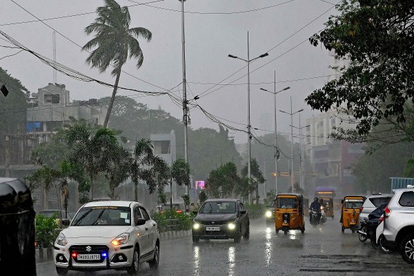 चेन्नई में आसमान में काले बादल छाने और बारिश होने से दिन में अंधेरा सा छा गया। इस दौरान वाहनों को दिन में भी लाइटें जलानी पड़ीं। फोटो— हरिहरन