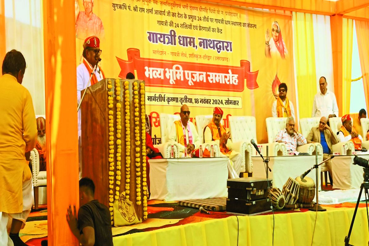 गायत्री धाम के शिलान्यास व भूमि पूजन समारोह में सम्बोधित करते पंजाब के राज्यपाल गुलाबचंद कटारिया