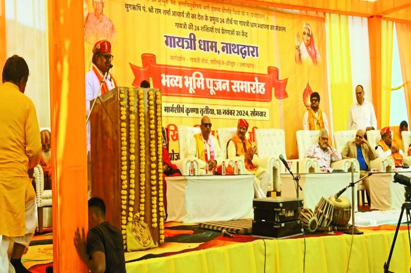 अखिल विश्व गायत्री परिवार ट्रस्ट राजसमंद के तत्वावधान में आयोजित समारोह में मुख्य यजमान के रूप में पूर्व विधायक सीपी जोशी ने कहा कि यह स्थान नाथद्वारा में बनाने की कल्पना उत्तराखंड में जाकर देखा और स्थान चयन किया गया। समारेाह को राष्ट्रीय स्वयं सेवक संघ के क्षेत्रीय प्रचारक श्रीवर्धन ने संबोधित करते हुए कहा कि यहां पर एक ऐसा धाम बनेगा, जो आने वाली पीढि़्यों को निरंतर संस्कारित करता रहेगा। राष्ट्रीय स्वयं सेवक संघ के द्वितीय सरसंघ चालक का भी पं. श्रीराम शर्मा आचार्य के संबंधों का जिक्र करते हुए कहा कि मथुरा के साथ हरिद्वार में केन्द्र बनाया गया। उन्होंने कहा कि संतों की वाणी कहती है कि किसी को मुक्ति लेनी है तो एक बार भारत में जन्म लेना पड़ता है।