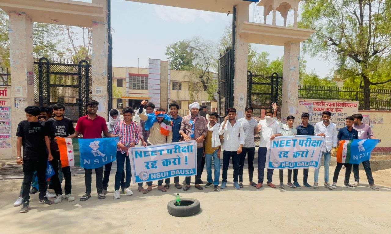 पारदर्शी जांच व परीक्षा को रद्द करने की मांग दौसा. एनएसयूआई कार्यकर्ताओं ने नीट परीक्षा में हुई धांधली के विरोध में गुरुवार को पीजी कॉलेज के बाहर नारे लगाकर व टायर जलाकर विरोध-प्रदर्शन किया गया। जिला अध्यक्ष विजेन्द्र गुर्जर के नेतृत्व में कार्यकर्ताओं ने नीट भर्ती परीक्षा की पारदर्शी जांच कराने और परीक्षा को रद्द करने की मांग की। उन्होंने कहा कि दिल्ली, पटना, झारखंड के कई सेन्टरों पर एक ही क्रम में बैठे अभ्यार्थियों के 720 में से 720 नम्बर आना भर्ती परीक्षा में सन्देह पैदा करता है। छात्र प्रतिनिधि अंकित सत्तावन ने बताया कि भर्ती परीक्षा में जो अभ्यार्थी परीक्षा देने लेट पहुंचे, उनको बोनस अंक किस आधार पर दिए हैं। इसका भी अभी तक कोई स्पष्टीकरण नहीं दिया है। वहीं इस भर्ती से पीडित परीक्षार्थियों ने आत्महत्या की है। सरकार को नीट भर्ती परीक्षा को तुरन्त प्रभाव से रद्द करना चाहिए। जो छात्र कोटा, जयपुर में रहकर तैयारी कर रहें हैं, उनको आर्थिक मुआवजा दिया जाना चाहिए। परीक्षा को रद्द नहीं करने पर एनएसयूआई ने उग्र आंदोलन की चेतावनी दी। इस दौरान उपाध्यक्ष विजेन्द्र डोई, पंकज सत्तावन, सचिव नेहरू गुर्जर, अंकित शर्मा, संजीव जैमन, पंकज पांचाल, सोहिल खान, सुमित, सागर, नरेश आदि कार्यकर्ता मौजूद रहे।