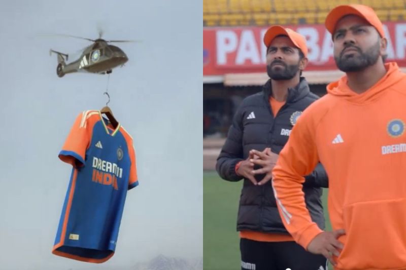 बीसीसीआई ने सोमवार को एक वीडियो जारी कर टीम इंडिया की जर्सी लॉन्च की। इस वीडियो में टीम इंडिया के कप्तान रोहित शर्मा, कुलदीप यादव और स्टार ऑलराउंडर रवींद्र जडेजा नजर आ रहे हैं। टीम इंडिया की जर्सी हेलीकॉप्टर से लॉन्च होती है और रोहित शर्मा, कुलदीप और जडेजा इस देखते रह जाते हैं। नई जर्सी के ऊपर सफेद पट्टी दिख रही है और बीच में नीला रंग है जबकि बाहों पर भगवा कलर नजर आ रहा है। गले पर तिरंगा चारों ओर बना हुआ है, जो इसकी खूबसुरती को बढ़ाता है।