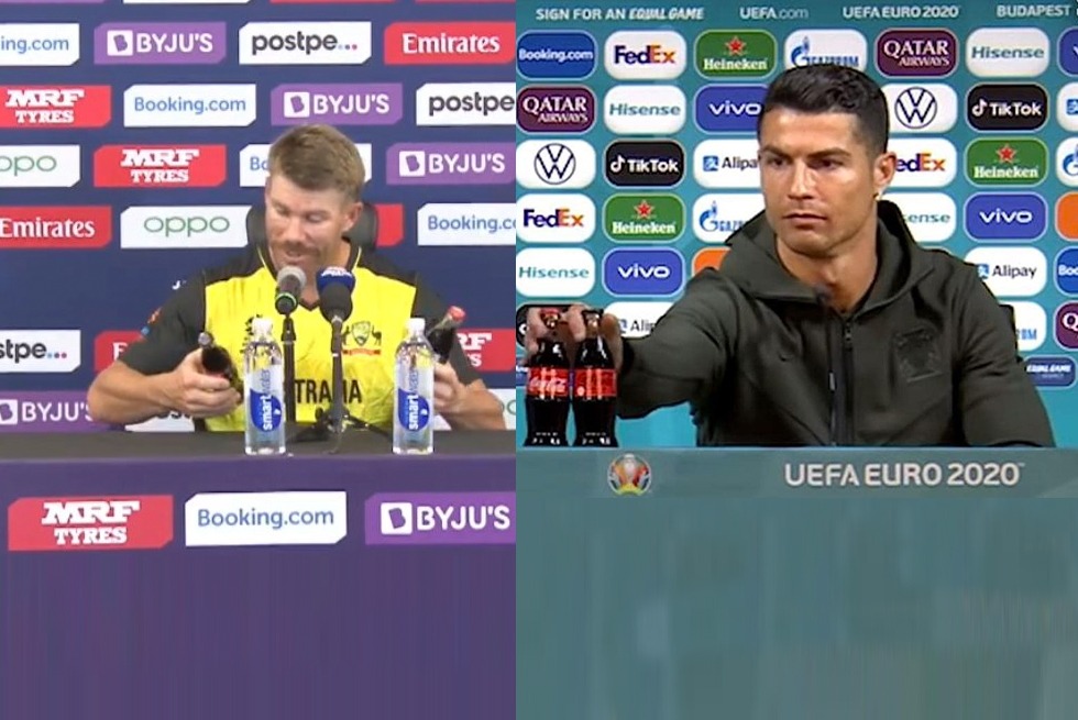 श्रीलंका के खिलाफ जबरदस्त बल्लेबाजी कर अर्धशतक लगाकर प्रेस कॉन्फ्रेंस में पहुंच वार्नर ने सबसे पहले टेबल पर रखी कोका कोला की बॉटल हटाने लगे. इसके बाद आईसीसी (ICC) का एक मेंबर वार्नर के पास गया और वार्नर को कुछ कहा. जिसके बाद वार्नर ने कोका कोला के बॉटल को वापस फिर से टेबल पर रख दिया. टेबल पर बॉटल को वापस रखते हुए वॉर्नर ने मजाकिया अंदाज में कहा कि क्या मैं इस हटा सकता हूं? क्या इसे मुझे वापस रखना पड़ेगा, उसके बाद उन्होंने कहा कि अगर ये क्रिस्टियानो रोनाल्डो के लिए बेहतर है तो ये मेरे लिए भी बेहतर है.