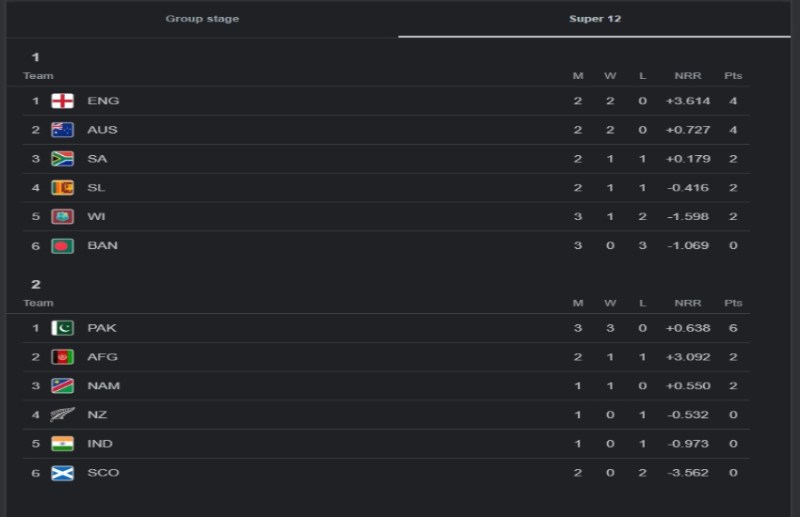 ग्रुप 1 में इंग्लैंड की टीम टॉप पर कायम है. इंग्लैंड ने अबतक दो मुकाबले खेले हैं जिन दोनों में उन्होंने जीत हासिल की है. इंग्लैंड के बाद इस ग्रुप में दूसरे स्थान पर ऑस्ट्रेलिया है जिसने अबतक इस टूर्नामेंट में 2 मुकाबले खेले हैं और दोनों जीते हैं. हालांकि नेट रनरेट में इंग्लैंड से पिछड़ने के कारण वह ग्रुप में दूसरे स्थान पर है.