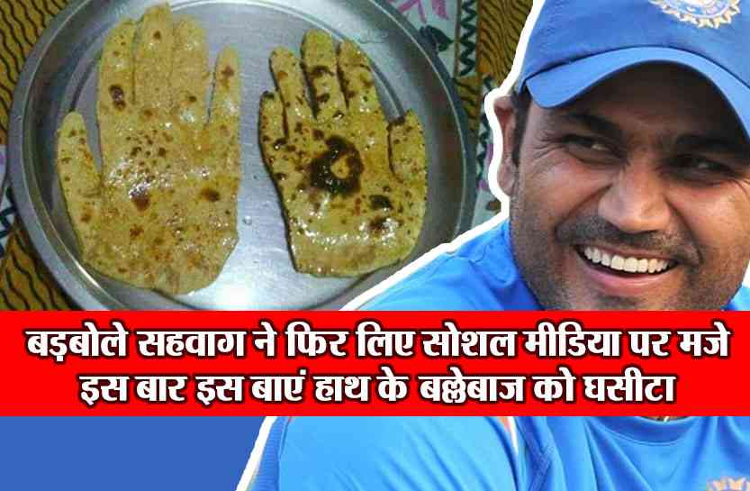 हाल ही में उन्होंने सोशल मीडिया पर इस बाएं हाथ के बल्लेबाज को निशाने पर लिया है। दरअसल वीरू ने ट्विटर पर हाथ के आकार की डिजाइन की 2 रोटी की फोटो डाली है। जिसमें एक रोटी छोटी है और दूसरी बड़ी, साथ में वीरू ने कैप्शन भी लिखा है। वीरू ने कैप्शन में लिखा है ''नई नवेली दुल्हन आई, पति बोला अपने हाथ की रोटी बना के खिलाओ।'' उनके इस ट्वीट को लोगों ने काफी पसंद किया जा रहा है। सहवाग यह ट्वीट करने के बाद भी नहीं रूके, उन्होंने स्पेशली पार्थिव पटेल को टैग करते हुए लिखा कि- ''भाई विकेट कीपिंग गल्व्स हैं या फिर भेजूं।'' उनके इस ट्वीट को भी काफी पसंद किया जा रहा है।
