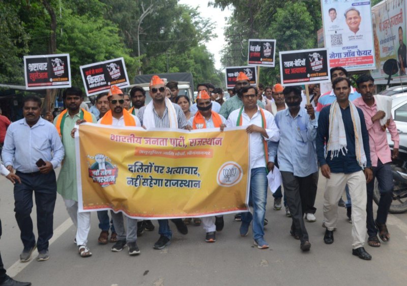 श्रीगंगानगर। भाजपा ने‘नहीं सहेगा राजस्थान’ अभियान के तहत मुंह पर काला कपड़ा बांधकर मौन रैली निकाली और कलक्ट्रेट पर राज्य की कांग्रेस सरकार के खिलाफ जोरदार प्रदर्शन किया ।भाजपा अनुसूचित जाति मोर्चा के शिष्टमंडल ने जिलाध्यक्ष शिवभगवान जोगपाल के नेतृत्व में शुक्रवार को कलक्टर के माध्यम से राज्यपाल के नाम ज्ञापन देकर दलित व आदिवासी समाज के लुटते स्वाभिमान को बचाने में नाकाम राजस्थान की कांग्रेस सरकार को अविलम्ब बर्खास्त करने की मांग कीँ। इससे पहले नेहरू पार्क से प्रारम्भ मौन रैली शहर के मुख्य-मुख्य मार्गों से होते हुए कलक्ट्रेट पहुंची, जहां भाजपा अनुसूचित जाति मोर्चा पदाधिकारियों व कार्यकर्ताओं ने कांग्रेस सरकार के विरूद्ध जमकर नारेबाजी की। भाजपाईयों का कहना था कि पिछले 4 साल 7 महीने में कांग्रेस सरकार के शासनकाल के दौरान दलितों पर अपराध तीन गुणा बढ़े हैं। दलितों के साथ अत्याचार, नाबालिग व महिला दुष्कर्म की घटनाओं में राजस्थान राज्य देश में प्रथम स्थान पर हो गया है। आदिवासियों पर अत्याचार में राजस्थान शीर्ष 3 राज्यों में है। थानागाजी में सामूहिक बलात्कार जैसी अनेक घटनाएं घटी है। करौली जिले के हिंडौन कस्बे में दलित समाज की बेटी के साथ गैंगरेप के बाद मारकर कुंए में डालने की हृदय विदारक घटना हुई है। भरतपुर में नंगू वाल्मीकि की हत्या, जालौर में नाबालिग इंद्र मेघवाल की हत्या, झालावाड़ में कृष्णा वाल्मीकि की हत्या, अलवर में योगेश जाटव की हत्या, पाली में जितेंद्र मेघवाल की हत्या, दौसा के लालसोट में आदिवासी महिला की सामूहिक दुष्कर्म के बाद हत्या, जोधपुर में ट्यूबवेल से पानी लेने पर आदिवासी व्यक्ति की हत्या, बालोतरा में दलित महिला की दुष्कर्म कर हत्या ने राजस्थान में दलित व आदिवासी समाज को हाशिए पर ला दिया है। पदाधिकारियों व कार्यकर्ताओं ने ‘नहीं सहेगा राजस्थान’ नारे लगाते हुए कहा कि राजस्थान में पुलिस थानों में पीड़ित पक्षों की एफ.आई.आर. तक दर्ज नहीं की जाती है। यदि एफ.आई.आर. दर्ज कर भी ली जाती है तो उस पर न्यायसंगत अनुसंधान नहीं किया जाता है, इससे पीड़ित पक्षों को उचित न्याय नहीं मिल पा रहा है। हर पल दलित व आदिवासी समाज का स्वाभिमान तार-तार हो रहा है। जिला महामंत्री श्रवण कुमार ने बताया कि इस दौरान भाजपा जिला महामंत्री प्रदीप धेरड़ , महिला मोर्चा जिलाध्यक्ष चेष्टा सरदाना, सीताराम मौर्य, संजय महिपाल, महेश पेड़ीवाल, किरण सुखीजा, गीता देवी, राजीव वर्मा, चन्द्रपाल वर्मा, राजीव चौधरी, दीपक डीगवाल, रोहित सारसर, मदन लाल आदि मौजूद थे।