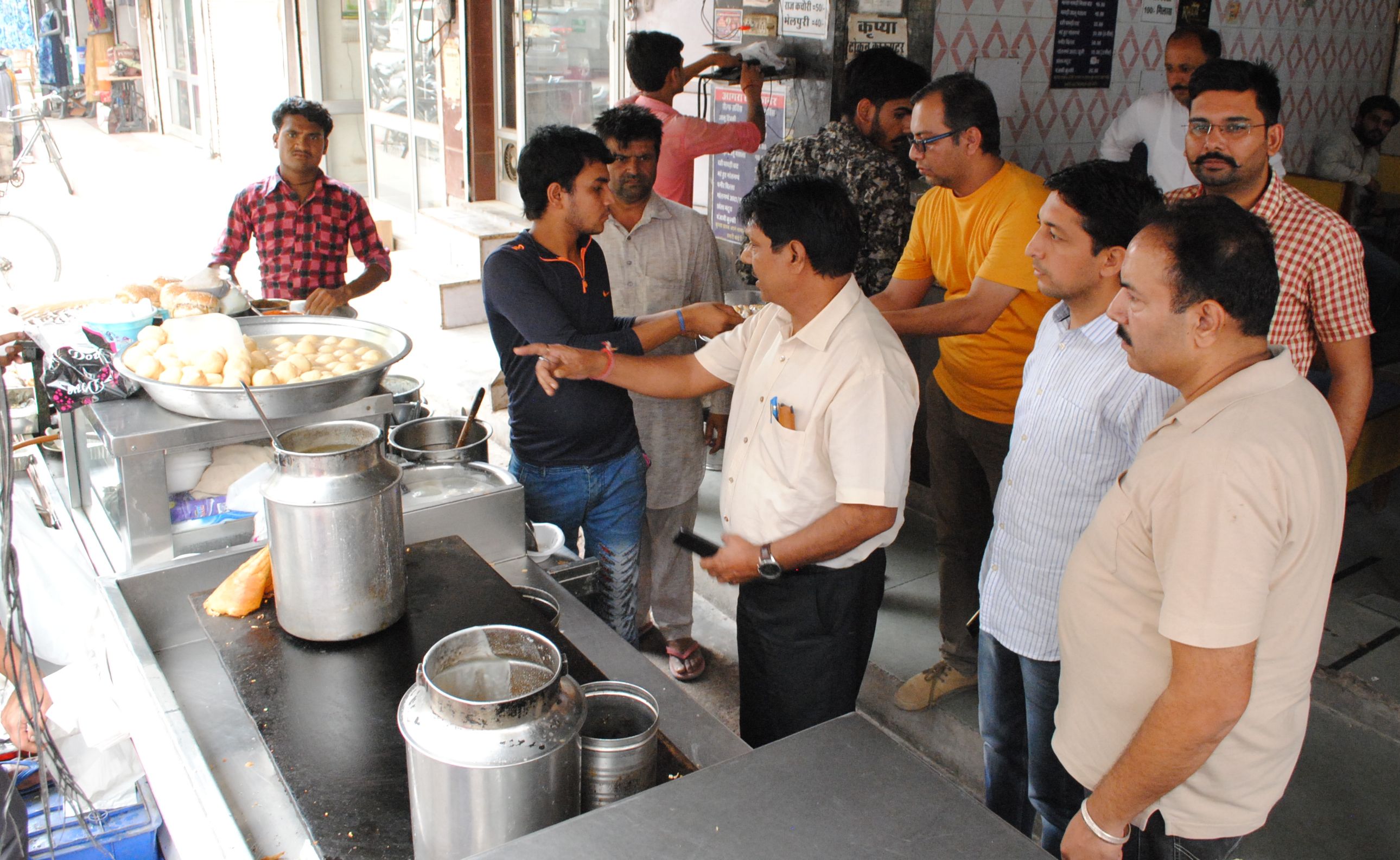हाथों में दस्ताने और खाद्य सामग्री को ढकने की नसीहत देकर छोड़ दिया। इस जांच टीम ने मुख्य बाजार के आगरा टिक्की, गोलबाजार के स्वीट कार्नर, तीन पुलिया के मामा श्यामा नमकीन भंडार, पुरानी आबादी सब्जी मंडी के पास मिठाई की दुकान पर जाकर चैकिंग की। इस दुकानों पर खाद्य वस्तुओं के बेचने के दौरान दुकानदारों और सैल्समैनों के हाथों में दस्ताने पहनने और खाद्य सामग्री को ढके रहने की हिदायत दी गई, ऐसा नहीं मिलने पर चालान की कार्रवाई की घुड़की दी।