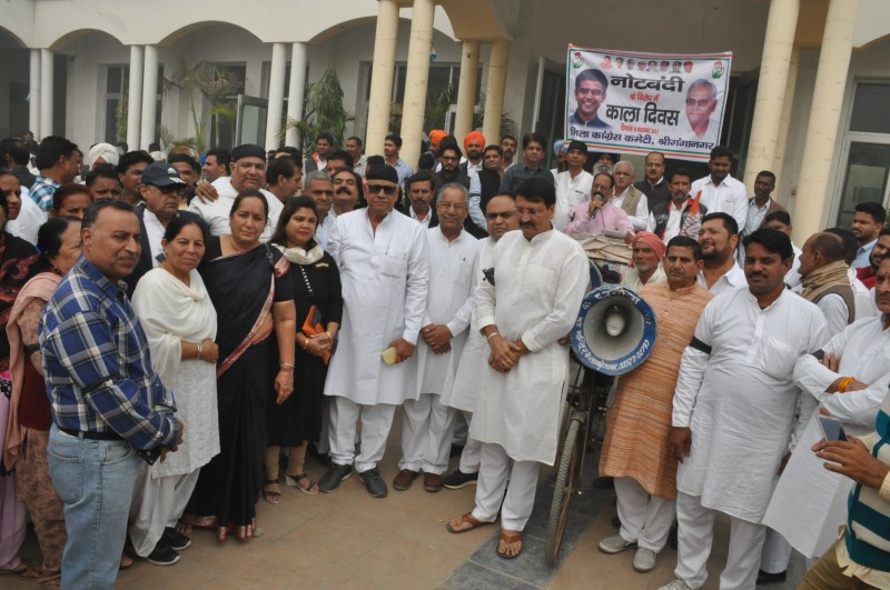 जिला कांग्रेस कमेटी ने बुधवार को नोटबंदी का एक साल पूरा होने पर इस दिन को काले दिवस के रुप में मनाया। कांग्रेसियों ने जिला अध्यक्ष संतोष सहारण के नेतृत्व में काली पट्टी बांधकर जिला कलक्ट्रेट पर प्रदर्शन किया और जिला कलक्टर ज्ञानाराम को ज्ञापन सौंपा।बड़ी संख्या में मौजूद कांग्रेस कार्यकर्ता जिला कांग्रेस कमेटी कार्यालय मोती पैलेस से सुबह हाथों पर काली पट्टी बांधकर जिला कलक्ट्रेट की तरफ रवाना हुए। ये मोदी और भाजपा सरकार विरोधी नारेबाजी कर रहे थे। जिला कलक्टर को प्रधानमंत्री नरेंद्र मोदी के नाम दिए ज्ञापन में इन्होंने बताया कि आठ नवंबर 2016 को रात्रि आठ बजे नोटबंदी का फैसला लिया गया था, और तत्काल प्रभाव से लागू भी कर दिया गया था। आपने इस फैसले के संदर्भ में दलील दी थी कि काले धन पर नकेल कसने, नकली मुद्रा पर रोक लगाने के लिए यह फैसला लिया गया है।