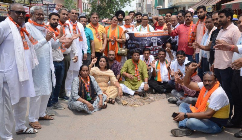 सड़क पर बने गडढ़ों पर धरना देकर जताया विरोध