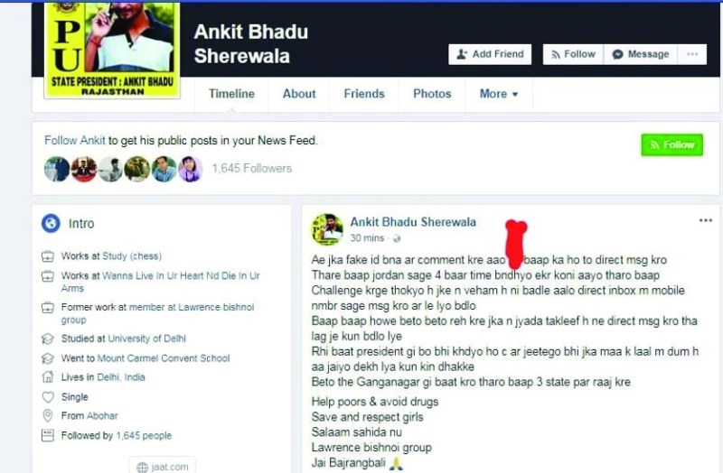 गैंगस्टर अंकित भादू ने अपनी खुद की एफबी पर शुक्रवार दोपहर करीब डेढ़ बजे एक पोस्ट डाली है। जिसमें लिखा है कि फेक आईडी बनाकर कमेंट करे ओ, बाप का हो तो डायरेक्ट मैसेज करो, थाने बाप जॉर्डन सागे चार बार टाइम बंधायो, एक अर कोनी आयो, थारो बाप। चैलेंज करके ठोक्यो है। जिसके वह है नी बदले, आलो डायरेक्ट इनबॉक्स में मोबाइल नंबर सागे मैसेज करो अर ले लेओ बदलो।