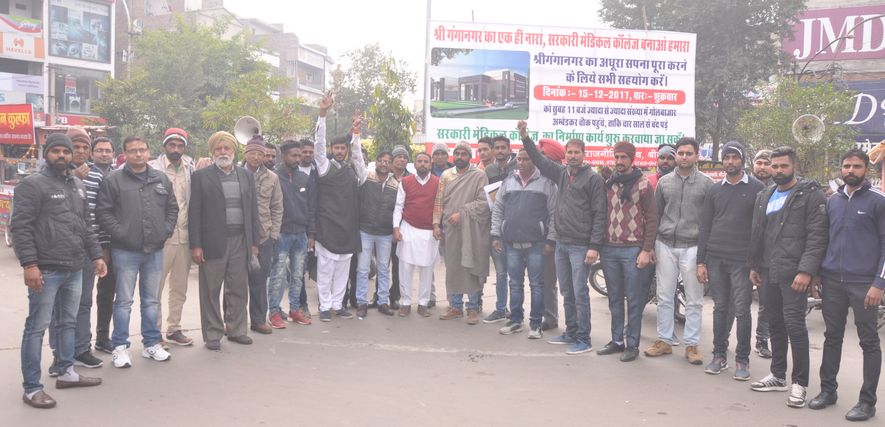 गंगानगर युवा मोर्चा ने शुक्रवार को अंबेडकर चौक पर धरना लगाकर मेडिकल कॉलेज के निर्माण की मांग की। वक्ताओं का कहना था कि मेडिकल कॉलेज निर्माण से इलाके में चिकित्सा सुविधाओं का विस्तार होगा। उनका कहना था कि गैर राजनीतिक मंच के जरिए मेडिकल कॉलेज का निर्माण शुरू करवाना संगठन का उद्देश्य है।