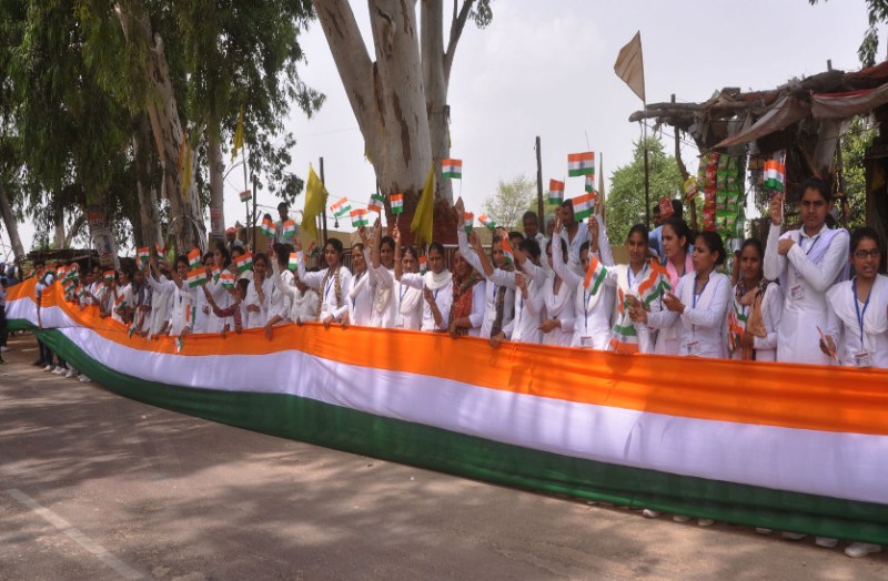 शहीदों को सम्मान देने के लिए श्रीगंगानगर जिला मुख्यालय पर मंगलवार को 'मानव शंृखलाÓ कार्यक्रम में जबर्दस्त उत्साह रहा। निर्धारित समय सुबह 10 बजे सुखाडिय़ा सर्किल के भारत माता चौक पर स्थापित 111 फीट के राष्ट्रीय ध्वज को फहराया गया। पूर्व केन्द्रीय मंत्री व सांसद निहालचंद, खान राज्यमंत्री सुरेन्द्रपाल सिंह टीटी और जिला कलक्टर ज्ञानाराम ने ध्वजारोहण के बाद मानव शंृखला को हरी झंडी दिखाई।