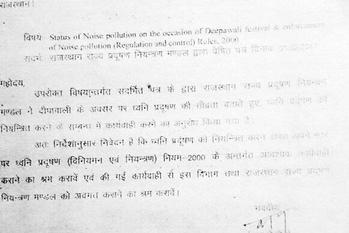 पर्यावरण विभाग के निदेशक एवं संयुक्त निदेशक आरके जैन ने सभी पुलिस अधीक्षक को आदेश दिए हैं कि वे ध्वनि प्रदूषण को नियन्त्रित करने के संबंध में अपने स्तर पर ध्वनि प्रदूषण (विनियमन एवं नियंत्रण) नियम-2000 के अन्तर्गत आवश्यक कार्यवाही करवाएं तथा की गई कार्यवाही का ब्यौरा पर्यावरण विभाग एवं राजस्थान राज्य प्रदूषण नियंत्रण मण्डल को दें।