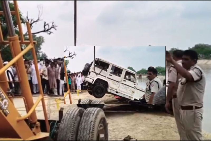बोलेरो को नहर से बाहर निकालती क्रेन (फोटो-पत्रिका)