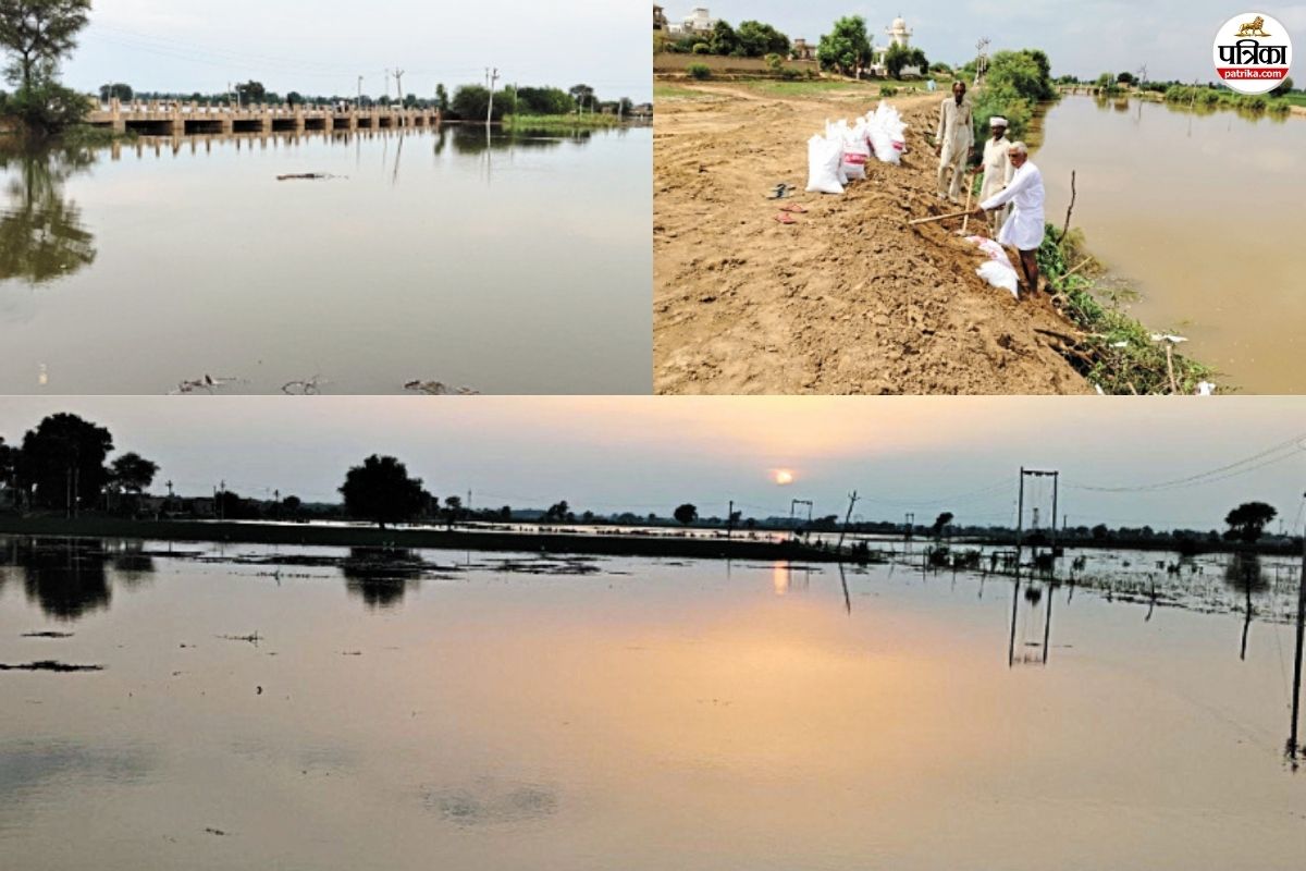 अनूपगढ़ पुल से निकलता घग्घर नदी का पानी, बंधा मजबूत करते किसान (फोटो-पत्रिका)