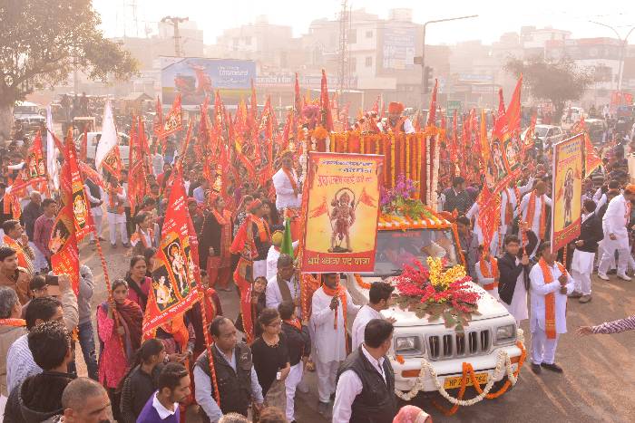 'लहर-लहर लहराए रे झंडा बजरंगबली का', 'एक दो तीन चार, बाबा तेरी जयजयकार' और फिजां में गूंजते एेसे ही कई भजन और जयघोष। भजनों की धुन पर थिरकते श्रद्धालु, जगह-जगह हाथ जोड़कर बाबा के दर्शन के लिए श्रद्धा से झुके लोग और हाथ में बाबा की ध्वजा लिए भक्त । श्री झांकीवाले बालाजी मंदिर के वार्षिकोत्सव के उपलक्ष्य में रविवार सुबह निकली धर्मध्वजा पद यात्रा में रविवार को कुछ एेसा ही माहौल था। शहर के अग्रसेन चौक से रवाना हुई शोभायात्रा में श्रद्धालुओं का उत्साह देखते ही बनता था। जिस भी मार्ग से शोभायात्रा गुजरी लोगों ने पुष्प वर्षा कर इसका स्वागत किया।